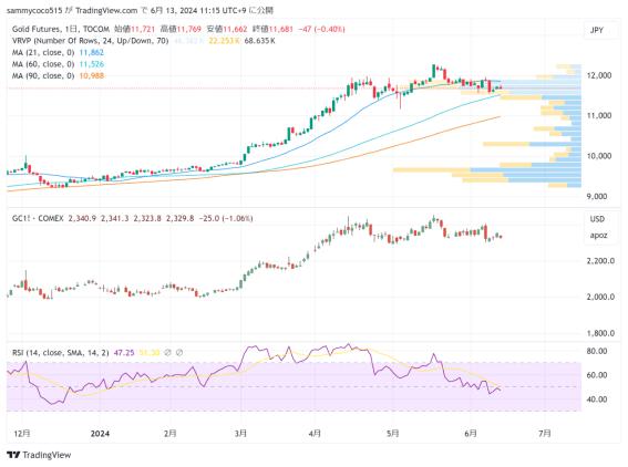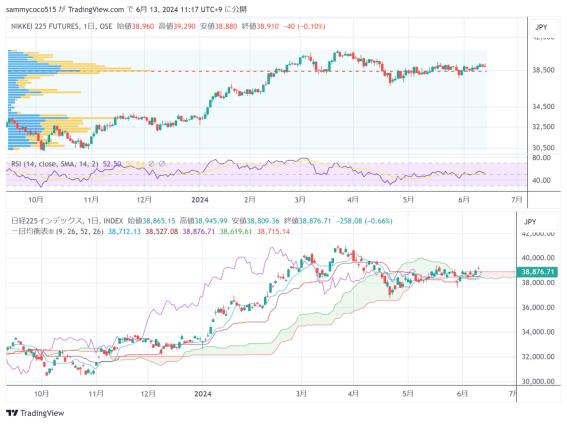 昨天的东京证券市场,在等待重要经济事件的背景下,持仓调整交易占据上风,日经平均指数未能保持39000日元整数位,小幅收低在38800日元水平。前一天的美股市场上,尽管NY道琼斯指数小幅收低,但高科技股比重较高的纳斯达克综合指数和机构投资者更加青睐的标普500指数继续上扬,并双双创下日内新高。东京市场的早盘尽管受到来自持仓调整的卖盘牵制,日经平均指数仍然表现出较强的韧性,市场整体并没有出现恐慌性的抛售。在等待美国消费者物价指数(CPI)的结果,FOMC 会议以及本周末日本央行的货币政策会议的背景下,总体呈现较强的观望氛围。进入欧美交易时间,先是美国5月份消费者价格指数(CPI)低于市场预期,推动标普500指数和纳斯达克综合指数,连续第三天创下新高。然而,之后公布的美国联邦公开市场委员会(FOMC)利率展望显示年底前仅有一次降息预期,使得美股市场各指数纷纷从盘中高点回落收盘。NY道琼斯指数最后也小幅收低在38700美元一线。日经指数期货在高科技表现强劲的影响下,最后收高在39200日元一线水平。