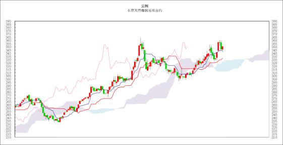 技术方面来看,东京橡胶在大幅震荡后回到350日元整数位一线收盘,短期呈现较为明显的高位振荡走势。一目均衡表上来,价格实体距离中期基准线较远,不排除有进一步下跌调整的可能。交易策略上建议逢高做空。