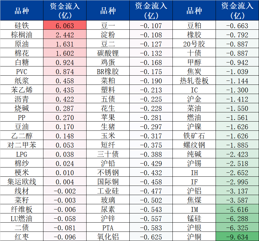 资金流入前三名为硅铁、棕榈油和原油;流出前三名分别为沪铜、沪银和锰硅。