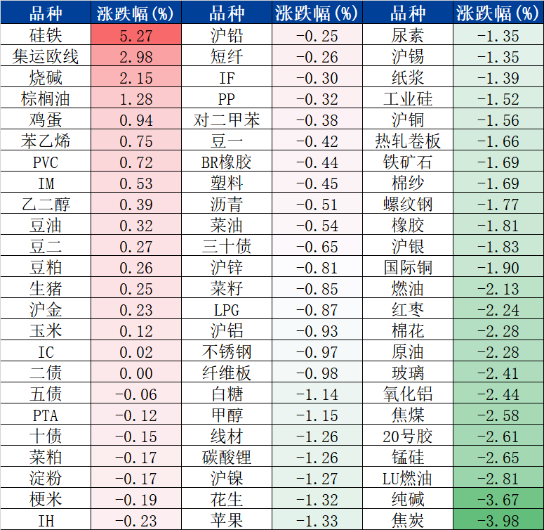 涨幅居前的三个品种分别是硅铁、集运欧线和烧碱;跌幅居前的是焦炭、纯碱和LU燃油。