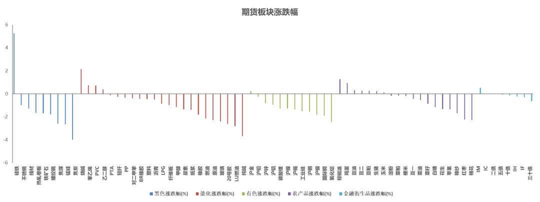 从板块整体表现看,农产品部分上涨,有色、黑色多数下跌。
