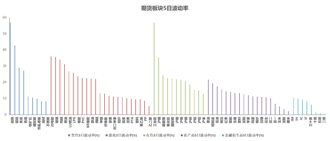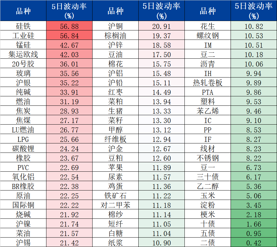 从5日波动率水平看,前三位为硅铁、工业硅和锰硅;低波动前三品种为二债、五债和十债。