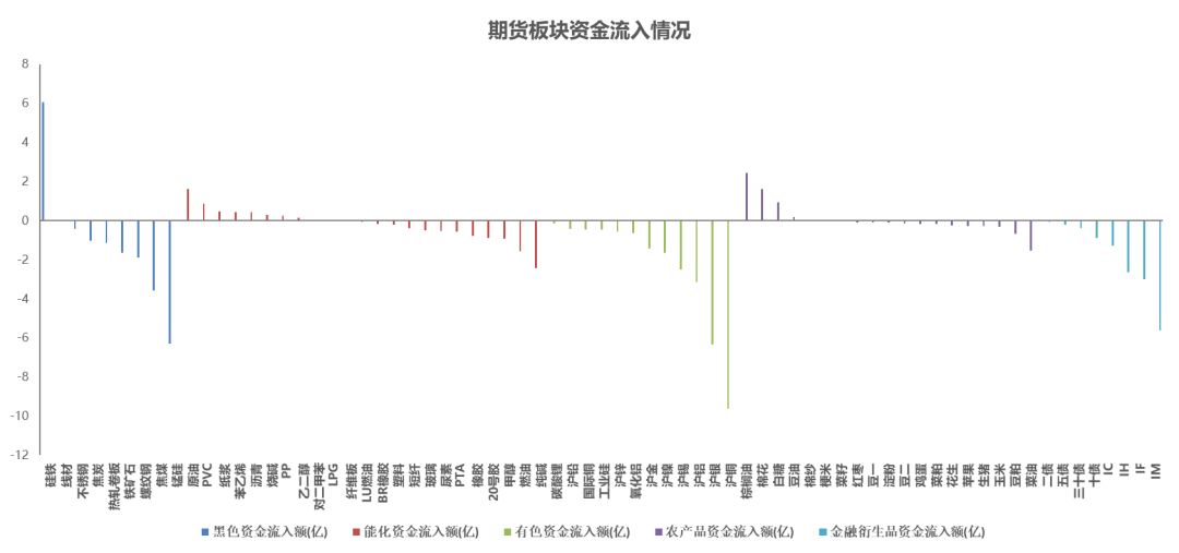 从板块资金流动情况来看,能化部分流入,有色、黑色多数流出。