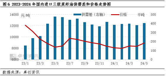 总体来看,2024年1-5月份国内进口菜籽油供应和需求呈现“双降”态势,由于需求量减幅较小,对进口菜籽油的价格支撑作用明显。