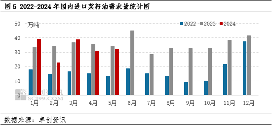国内对进口菜籽油的消费以食用为主,占比在90%左右。少量用于化工领域,占比在10%左右。进入2024年之后,随着进口菜籽油价格上涨,下游市场对高价菜籽油接受程度有限,导致需求量减少,据卓创资讯统计,2024年1-5月份国内进口菜籽油需求量在163.2万吨,较2023年同期相比减少6.85%。