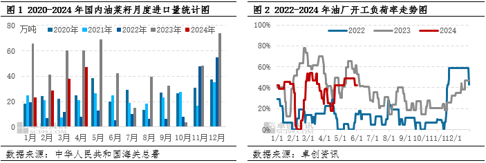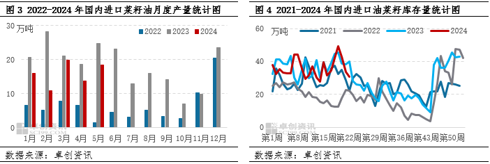 2023年国内油菜籽进口量明显增加,达到549.1万吨,较2022年相比增加180.01%。由于原料进口油菜籽供应量上升,国内进口菜籽油产能随之提高。据卓创资讯统计,2023年国内进口菜籽油产能在467.1万吨,较2022年相比增加8.70%。然而进入2024年之后,由于下游市场对菜籽油和菜籽粕需求量有限,国内油厂开始减少原料油菜籽的进口量。据卓创资讯统计,2024年1-4月份国内油菜籽进口量为136.2万吨,较2023年同期相比减少39.81%。