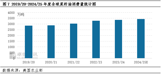 随着全球生物柴油消费量增加,菜籽油消费量同样上升。据美国农业部数据显示,2023/24全球菜籽油消费量在3352万吨,较上一年度相比增加2.57%;2024/25年度全球菜籽油消费量预计将增加至3436万吨,较上一年度相比增加2.51%。全球菜籽油消费量增加,带动全球油菜籽消费量上升,提振全球油菜籽价格,导致国内进口菜籽油生产成本提升,同样支撑国内进口菜籽油价格上调。
