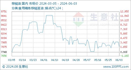 6月3日,生意社棕榈油基准价为8008.00元/吨,与本月初持平。