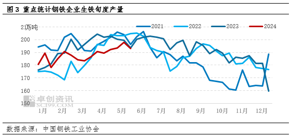 5月以来各地房地产利好政策虽然不断加码,但具体政策效果还未显现,钢厂心态从乐观转向悲观,随着钢材需求转弱钢厂利润微薄,外加季节性淡季和夏季用电高峰的到来,铁水产量基本已经达到峰值,个别钢厂出现临时检修计划。据中国钢铁工业协会统计数据显示,2024年5月下旬重点钢企生铁日均产量193.08万吨,旬环比下降2.42%,同比下降0.20%。