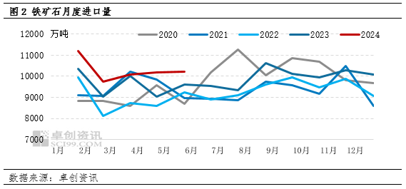 随着金融驱动减弱,铁矿石交易逻辑从金融属性切换至弱现实基本面。近期全球铁矿石发运虽出现小幅回落,但港口到港量保持同比偏高水平。今年前五个月矿山发运量较高,铁矿石进口量呈现出显著的增长态势,5月中国进口铁矿砂及其精矿10203.3万吨,较上月增加21.5万吨,环比增长0.2%,同比大幅增加6.09%,超过往年同期;1-5月累计进口51374.6万吨,同比增长7%,供应端继续保持宽松。
