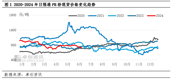 5月下旬以来,铁矿石价格整体呈现下跌走势,截至6月13日,日照港PB粉现货价格805元/吨左右,较5月22日下跌将近100元/吨。矿价下跌的驱动主要来源于宏观政策阶段性的真空,短期的数据不及预期导致乐观资金情绪消退;同时产业基本面转弱,成材进入淡季,阶段性库存压力上升,而铁矿库存持续增加,过剩压力加大,三者共振驱动矿价降幅加大。随着风险释放后,市场情绪有所缓和,刚需入场补库,成交量价齐升。