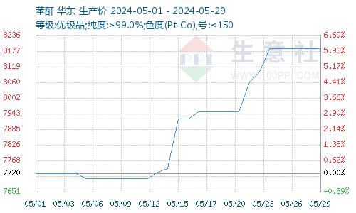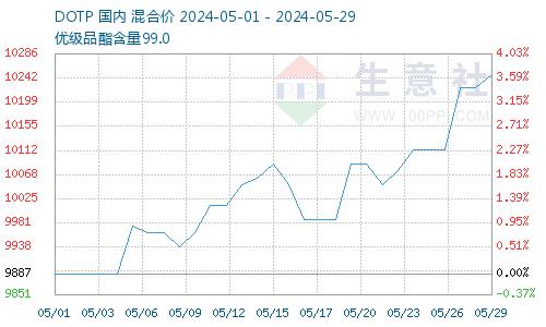 据生意社商品行情分析系统,截止5月29日,增塑剂DOTP价格10250元/吨,较月初5月1日DOTP价格9887.50元/吨上涨,涨幅3.67%。增塑剂原材料苯酐价格上涨,异辛醇价格震荡上涨,增塑剂成本上涨,增塑剂DOTP盈利下降,增塑剂DOTP企业开工下降,增塑剂DOTP供给减少。