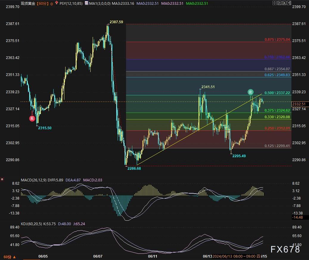 从日图以下的级别看,1小时图显示,金价自2286以来的反弹,持续多次受到2387-2286区间50%回档的压制,周五收盘前再次验证了这种压制但受到了37.5%回档的有效支撑,这也说明多空拉锯较为明显。