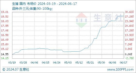 6月17日,生意社生猪基准价为18.60元/公斤,与本月初(17.42元/公斤)相比,上涨了6.77%。