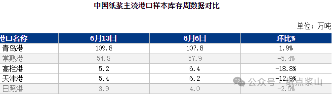 截止2024年6月13日,中国纸浆主流港口样本库存量:179.1万吨,较上期下降3.2万吨,环比下降1.8%,库存量在本周呈现窄幅去库的走势。本周期纸浆国内主流港口青岛港库存呈现累库的状态,港上出货速度较上周期变动不大,目前基本维持1.3万吨/天左右,整体库存量变动不大。本周期常熟港库存量呈现去库的走势,出货数量较上周期增加,周期内累计出货超过10万吨。整体来看,港口库存处于年内中位水平,本期国内主流港口样本库存呈现窄幅累库的状态。
