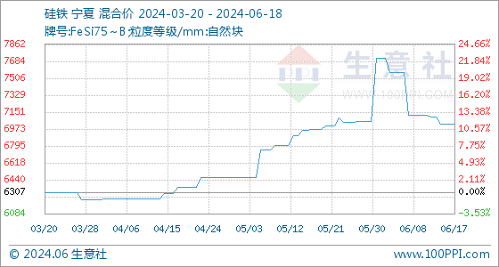 6月18日,生意社硅铁基准价为7028.57元/吨,与本月初(7714.29元/吨)相比,下降了-8.89%。