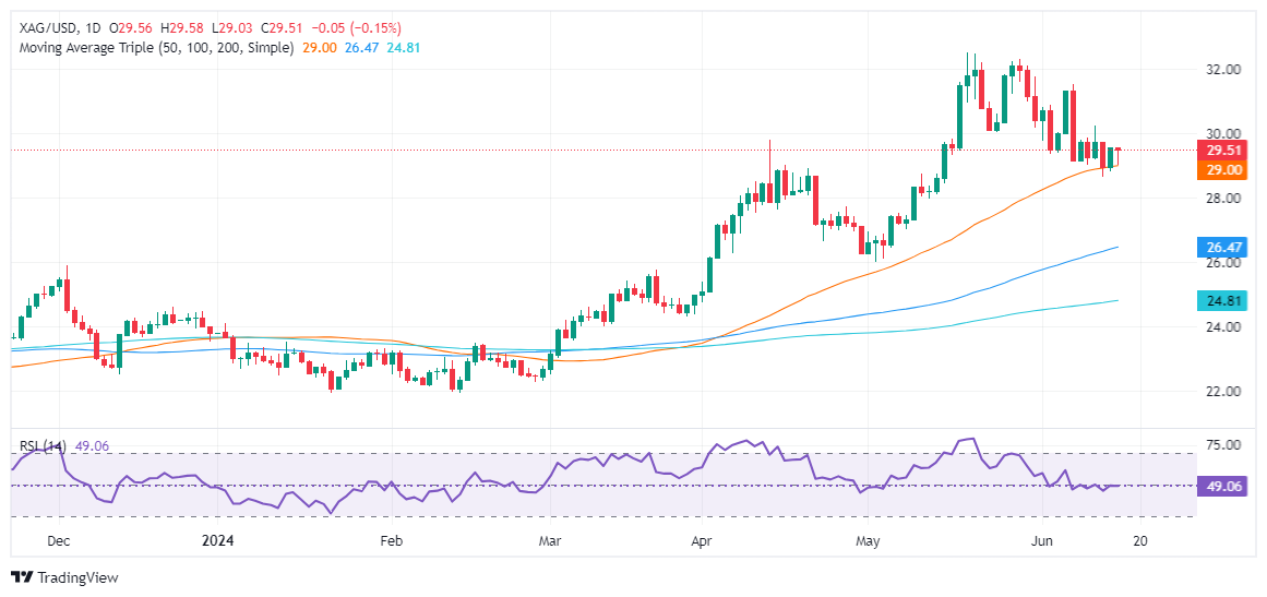 周一(6月17日),尽管美元走软,但现货白银价格仍然遭受打击,一度逼近29.00美元/盎司重要关口。周二(6月18日)亚市,现货白银小幅反弹,目前交投于29.57美元/盎司附近。FXStreet分析师Christian Borjon Valencia最新撰文,对银价技术前景进行分析。