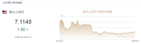 6月18日,人民币中间价报7.1148,上调1点,上一交易日中间价报7.1149。
