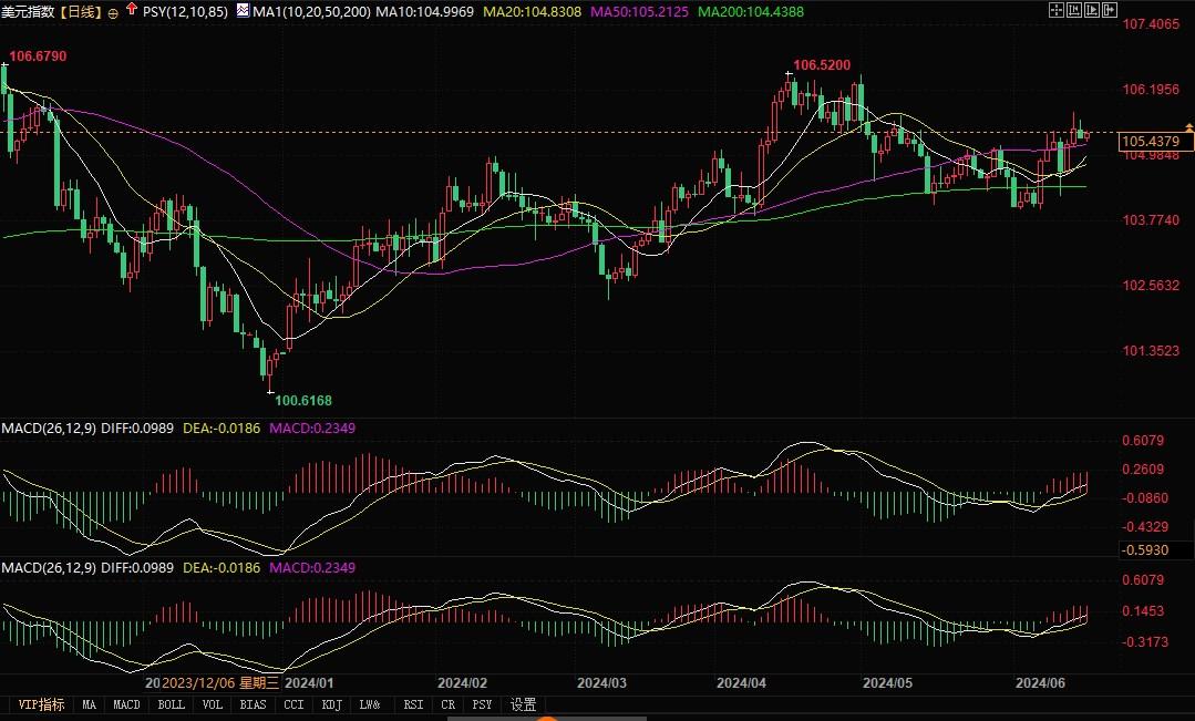 北京时间6月18日13:42,美元指数报105.43