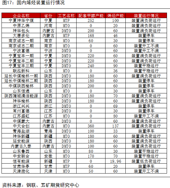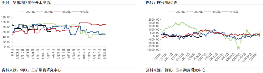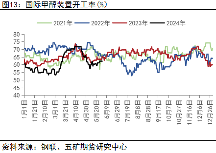甲醇制烯烃作为甲醇最主要的下游需求,在原料煤炭不出现极端走势的情况下, 其利润直接影响甲醇价格的上行高度。今年一季度港口外采装置开工尚可,但持续的低利润使得企业计划检修增多,五月份下游集中停车,华东烯烃装置开工大幅下行,负反馈开始传导到上游,甲醇现货随即出现大幅下跌。