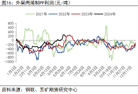 甲醇制烯烃产能已达1750万吨,占据国内甲醇总需求的50%以上。港口外采装置的开工情况对于甲醇的影响更为重要,随着国内甲醇的不断走强以及MTO下游产品的持续弱势,甲醇制烯烃的利润在逐年下移且不断创出新低,今年从大的层面来看,甲醇投产已步入尾声,而聚乙烯、聚丙烯仍有较高投产投放增速,预期全年MTO企业利润区间仍以下移为主。但当前利润已经压缩到历史同期低位水平,在甲醇淡季加上外采MTO装置的停车,预计MTO利润有一定修复需求。近期MTO现货利润已从低位反弹,但盘面由于甲醇基差修复,整体MTO利润修复幅度较为有限。总体来看,09合约MTO利润预计仍有一定修复空间,甲醇价格的走强需求看到沿海MTO装置的重启带来需求的走高,甲醇09合约的上行高度受限于下游的低利润。