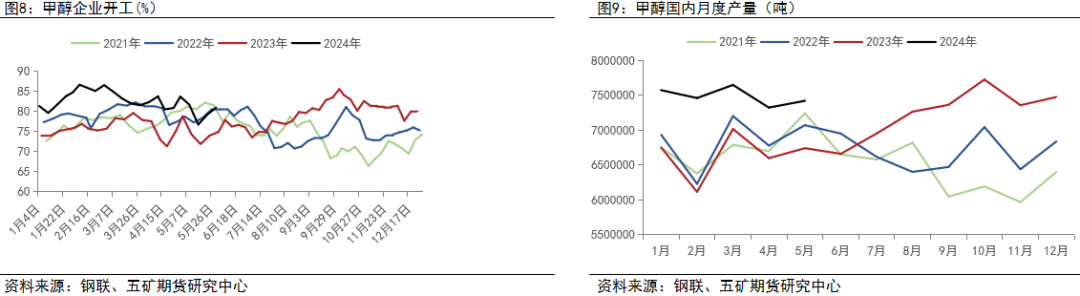 今年国内只有几套小装置投产,整体新增产能投放有限。但是国内存量装置仍较多,今年开工整体同比偏高,春检幅度不及预期,主要源于企业生产利润出现大幅改善,而利润改善的原因一方面在于煤炭一季度的明显走弱,另外一方面在于社会库存持续的低位支撑现货价格不断走强,库存的低位主要归因于今年进口的持续不及预期,伊朗谈判僵持以及外盘装置的意外停车。从后续来看,随着春检的逐步结束,企业利润虽有回落但整体仍较好,国内供应逐步回升,进口端到港也将逐步走高,在接下来的淡季供应仍有一定压力。