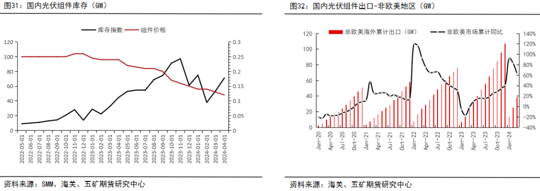 光伏组件排产在年初出现了超预期增长,增量主要来自于海外非欧美国家需求的超预期增长,截止2024年3月,光伏组件累计出口68GW,累计同比增加38%,非欧美海外累计出口累计同比增速超60%。值得注意的是,进入4月以后国内光伏组件库存开始持续走高,后续光伏排产环比走弱可能较大。整体而言,组件价格的走低拉动了组件需求的提升,2024年光伏组件产量预计将维持正增长态势,后续需密切关注国内装机情况。