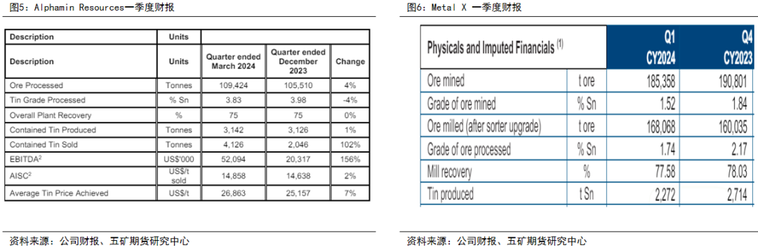 澳大利亚Metal X由于矿石品味下降以及高品位矿山开采计划延后影响,一季度锡精矿产量小幅下降;5月高品位矿山开采计划将重新开启,后续锡精矿产量预计将小幅上涨。