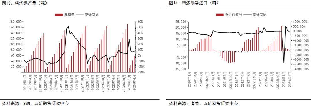 国内精炼锡产量方面,年初锡精矿进口同比增加也带动了国内精炼锡产量的提高,下半年除缅甸外锡精矿进口预计将进一步增加,国内精炼锡产量较去年预计有所上涨。进出口方面受进口窗口关闭影响,净进口较去年预计大幅度下降。整体而言,2024年国内精炼锡供应较2023年或小幅度下跌,后续需密切关注印尼出口恢复后内外比价变化情况。