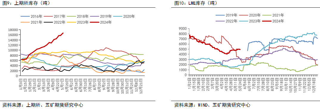 今年印尼锡出口受到严重影响,原因是印尼矿产部的审批程序发生了变化,导致矿业公司年度工作计划的审批被延迟;而这一延迟的部分原因是正在对以前的腐败和非法采矿活动进行调查。印尼司法部长办公室继续列出与这些调查有关的更多嫌疑人,涉及主要矿业公司的前任和现任高管,这进一步影响了出口许可证的续期。截止2024年4月,印尼累计出口精炼锡6993.26吨,累计同比下降58.3%。现阶段印尼锡锭出口已经恢复正常,但出口量并未出现超预期反弹,后续需密切关注LME库存变化情况。