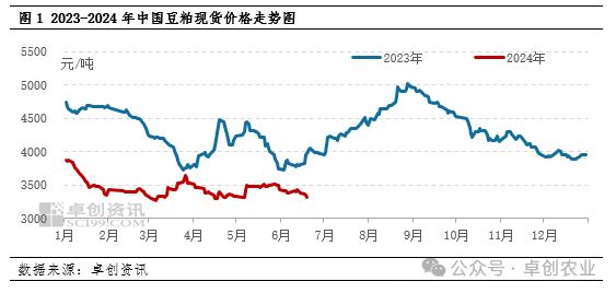 进入6月,国内豆粕现货价格呈现先涨后跌走势,截至6月17日,国内43%蛋白豆粕现货均价为3312元/吨,较月初价格下跌75元/吨,月内均价为3379元/吨,环比5月均价回落97元/吨,同比回落511元/吨。现货价格逐步向本年度最低点3月6日的3268元/吨靠近。分析原因来看,目前市场正处于供大于求,企业豆粕库存逐步上升的周期,原料大豆到港保持充裕,工厂开机保持高位运行,下游提货表现不佳,供应压力施压豆粕价格下行。基差方面来看,截至6月17日,华东地区现货基差参考负190元/吨,华北地区参考负100元/吨,山东地区参考负180元/吨,华南地区参考负120元/吨,较月初基差下调40-70元/吨不等。现货价格表现弱于期货价格,是基差走弱的主要原因。