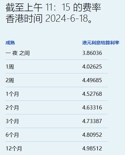 6月18日,港元拆息个别发展,隔夜息回落至3.86036%,与楼按相关的一个月拆息连升两天,报4.52768%,为4月2日以来最高。此外,两周拆息进一步涨至4.49685%,反映银行资金成本的三个月拆息维持4.73387%,六个月期亦无变动。一年期则微降至4.98512%。
