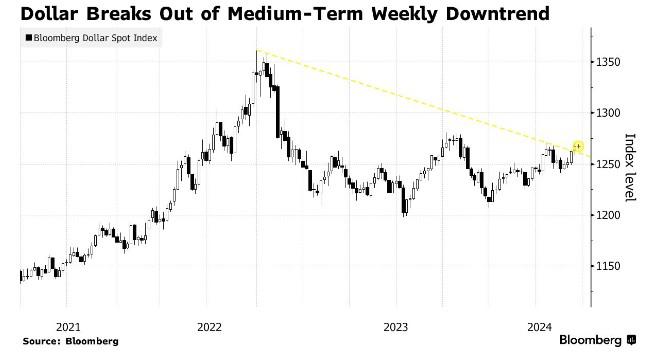 智通财经APP注意到,随着美国国债收益率的上升,以及投资者因欧洲政治不确定性而涌向世界储备货币,美元正接近2024年的新高。