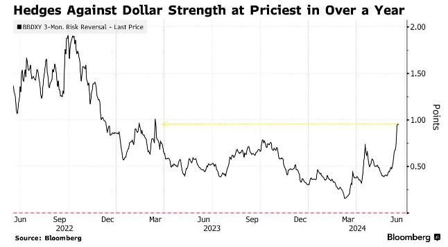 彭博美元即期指数距离去年11月以来的水平仅一步之遥,技术指标显示美元的强势还有上升空间。对冲未来三个月美元相对于一篮子货币升值的溢价已升至一年多来的最高水平。