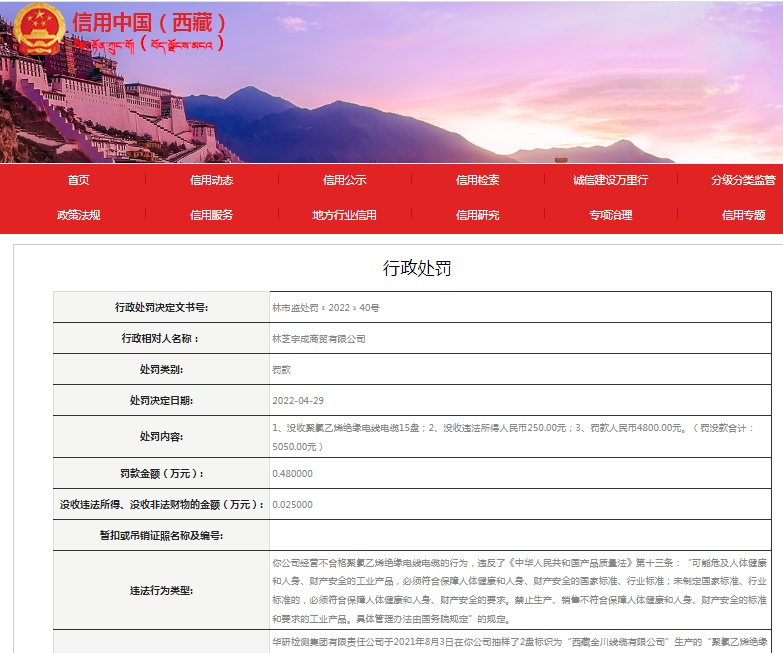 金融界消息,近日林芝宇成商贸有限公司因经营不合格聚氯乙烯绝缘电线电缆,被林芝市市场监督管理局处罚,包括没收聚氯乙烯绝缘电线电缆15盘、没收违法所得人民币250元、罚款人民币4800元。