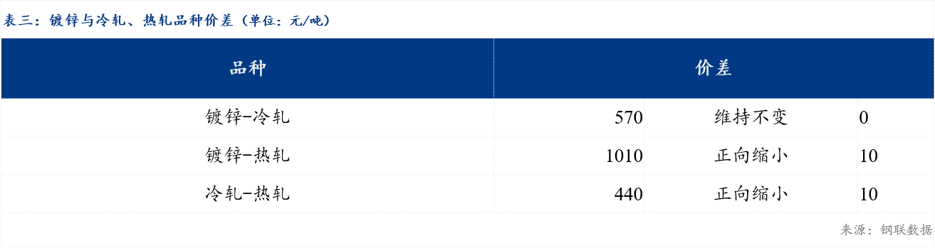 今日冷轧板卷乐从与天津价差较上一交易日收窄10元/吨,乐从与上海价差较上一交易日收窄10元/吨;镀锌板卷乐从与天津价差较上一交易日扩大10元/吨,与上海价差较上一交易日扩大10元/吨。品种价差方面,镀冷价差较上一交易日持平,镀热价差较上一交易日收窄10元/吨,冷热价差较上一交易日收窄10元/吨。
