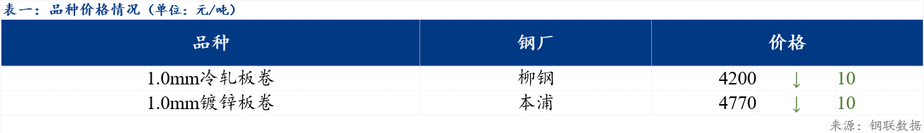 今日市场冷轧板卷主流资源价格4200元/吨,较上一交易日下跌10元/吨;镀锌板卷主流资源价格4770元/吨,较上一交易日下跌10元/吨。