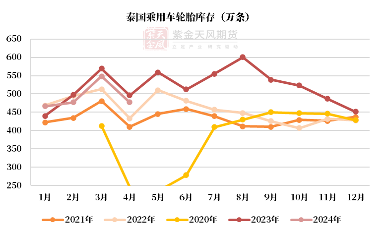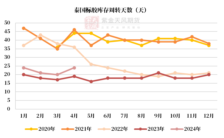 标胶库存情况:2024年4月泰国标胶库存周转天数同比去年4月增加26%(库存相对去年较高),处于历史偏低位置。考虑到今年标胶出口总量同比大幅增加29.8%,处于历史高位,我们推测今年泰标的数量并不算太少。
