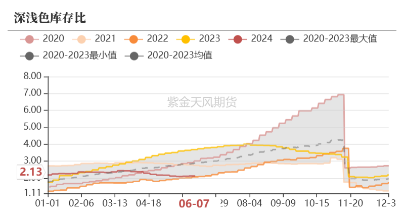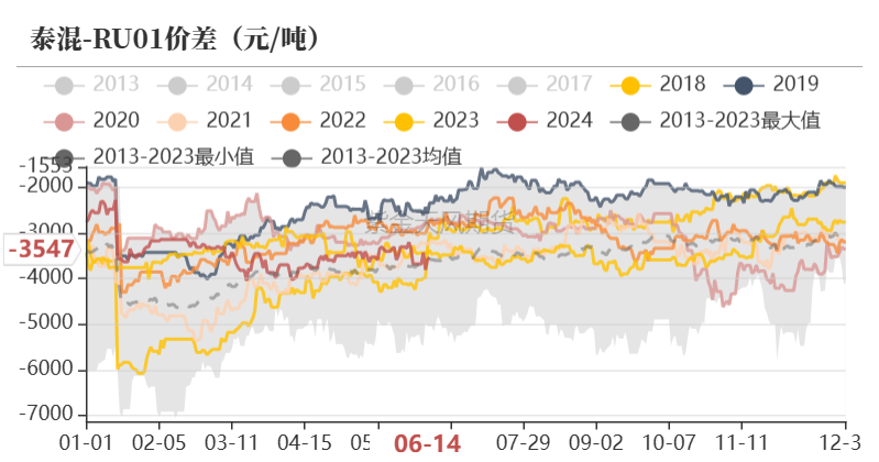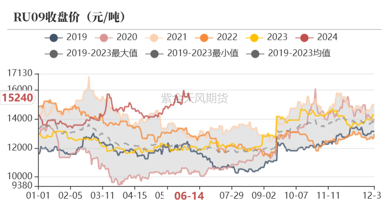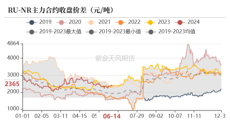 RU2409:5月,泰国开割推后,供应偏紧需求很好的背景下,RU2409被推高。6月中下旬,泰国供应上量的态势较为确定,6-9月交割前,供应相对5月偏宽松,叠加三季度需求逐渐进入淡季,RU2409相对估值偏低。风险点为收储,可能会再次推高RU2409。