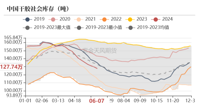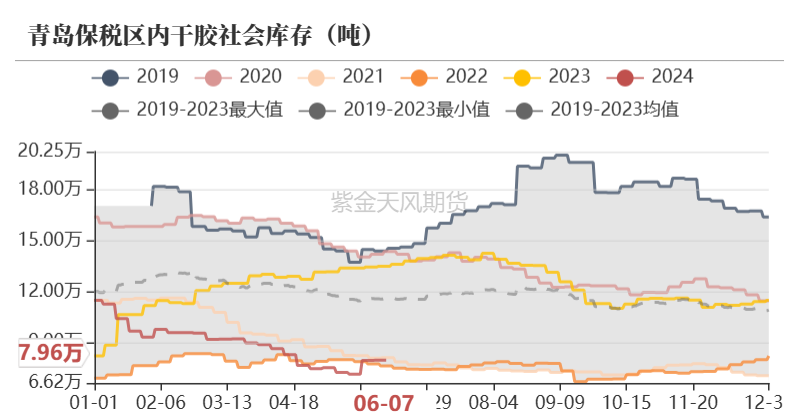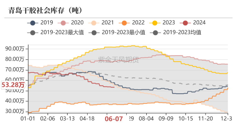 干胶库存情况:截至2024年6月,中国干胶库存同比去年6月减少20.7%,处于历史偏低位置。