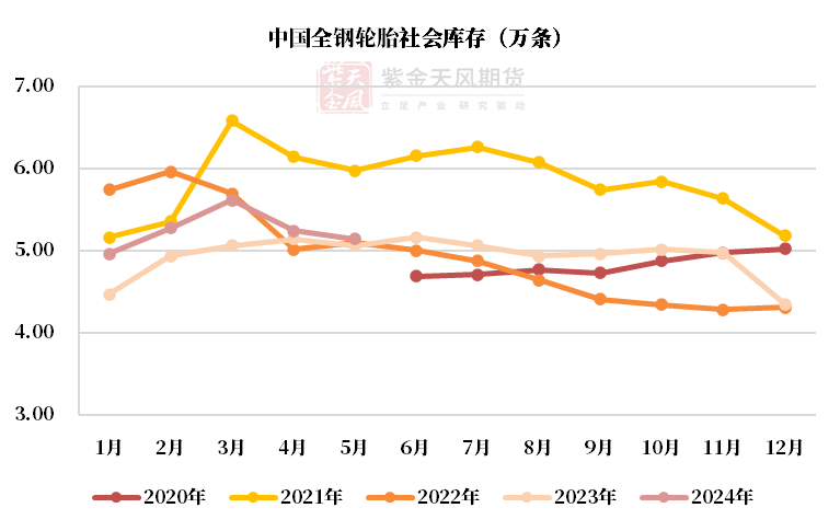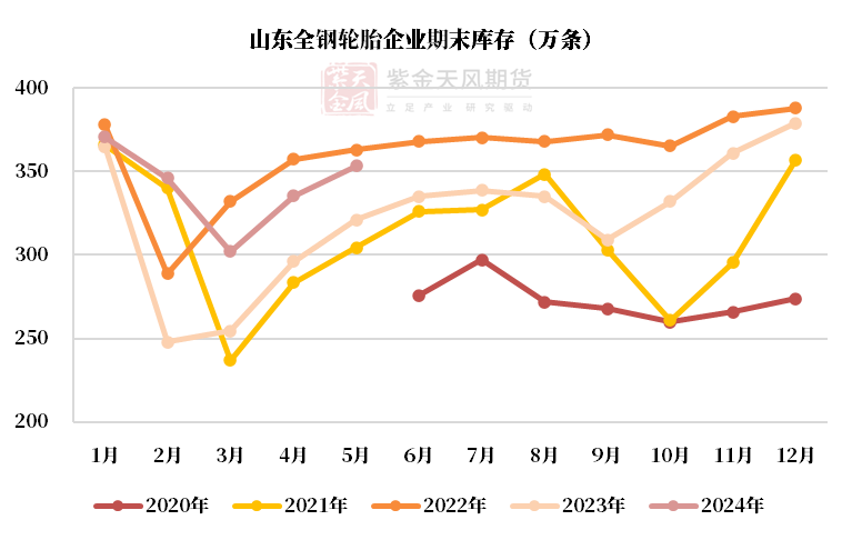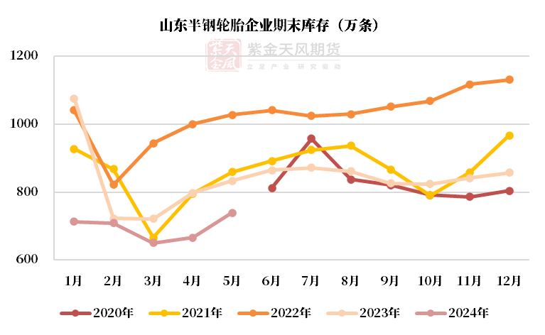 全钢轮胎库存情况:2024年5月山东全钢轮胎企业库存同比去年5月增加10.1%,处于历史偏高位置。考虑到今年全钢轮胎出口总量同比增加3.5%,处于历史高位,我们推测今年海外全钢轮胎也存在一定量的需求。