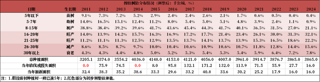 树龄分布情况:首先,我们假设苗树种植时一般已满5年(购买现成树苗),则2年后新种的苗树进入初产期,10年后进入旺产期,20年后进入减产衰老期。通过ANRPC和泰国橡胶局1996-2023年的新种和翻新面积数据(翻新:老胶树推倒后的重植),推算2024年苗树、幼树和初产期的胶树种植面积约占22.4%,旺产期的胶树种植面积约占54.3%,减产期的胶树种植面积约占23.3%。旺产期的胶树仍占据主导地位。