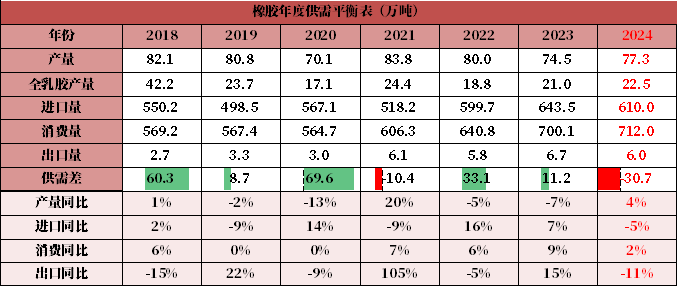 推论:我们不难得到以下公式,2023年1-5月中国深色胶库存累库量+2024年1-5月中国深色胶库存去库量=2024年1-5月中国轮胎消耗天然橡胶较去年同期的变化量+2024年1-5月中国进口深色胶较去年同期的变化量。推论一:综合深色胶进口情况,大致推算可得,2024年5月中国进口深色胶较去年同期减少约6.4万吨左右。推论二:若全年轮胎产量保持1-5月的同比增速,则今年生产轮胎所需要的橡胶总量约为490万吨,大致估算可得,今年橡胶需求约为700-730万吨。
