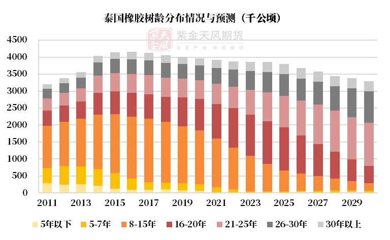 树龄结构预测:综合考虑割胶意愿和树龄结构,泰国单产和最大释放产量呈逐年递减的趋势。由于近3年泰国无新种面积,翻新面积也很少,我们判断泰国减产的趋势将延续。悲观估计下,2027年旺产期的胶树种植面积占比达到最大,随后开始下降;到2030年减产期的胶树种植面积占比将上升14%到37.3%。