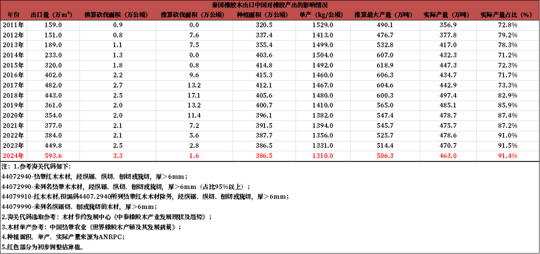 橡胶木出口换算砍伐面积:泰国政府每年批准采伐约6.4万公顷的橡胶树,产出的锯材出口往中国占比超90%。基于相关文献的假设,我们推算出2021-2024年平均每年的砍伐面积在2.5万公顷左右(大于新种和翻新面积),且呈逐年递增的趋势。