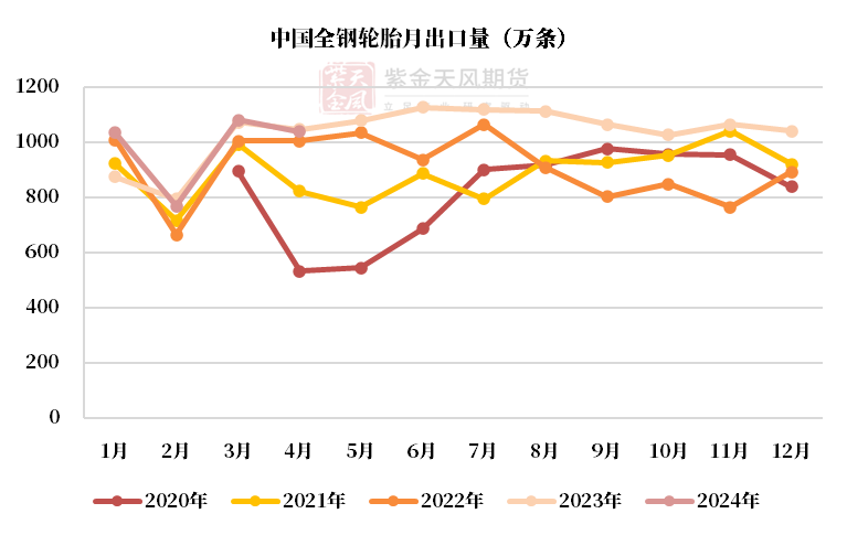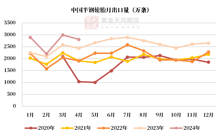 半钢轮胎出口情况:2024年1-4月中国半钢轮胎出口总量为10885万条,同比大幅增加16.5%,处于历史高位。其中,出口往美国的半钢轮胎出口量同比大幅减少35.4%。