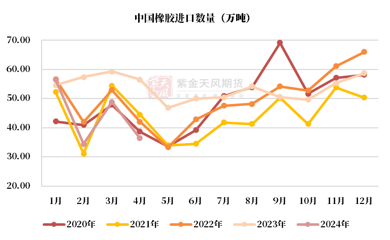 天然橡胶进口情况:2024年1-4月中国天然橡胶进口总量为69.7万吨,同比大幅减少18.9%,处于历史偏低位置。