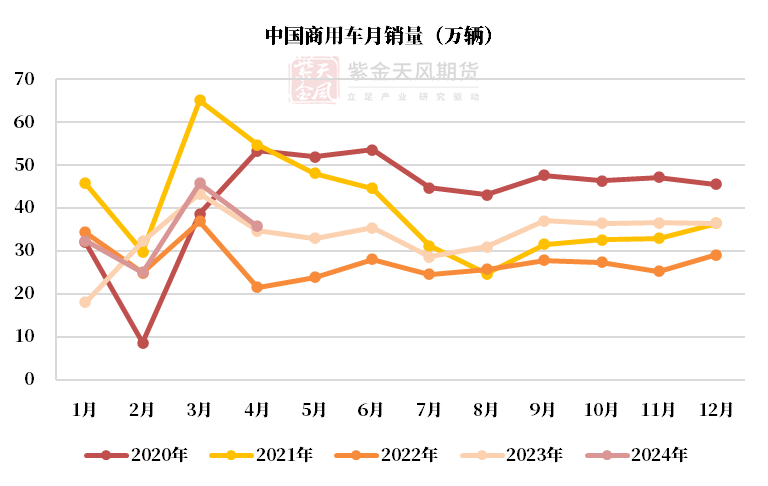 商用车消费情况:2024年1-4月中国商用车销量为139.0万辆,同比大幅增加8.1%,处于历史均值附近,不如2021年。2024年1-4月中国商用车销量略大于产量。