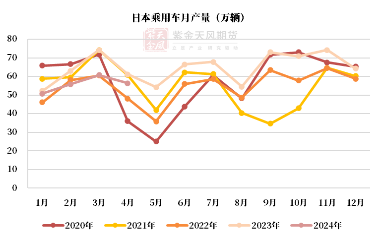 乘用车生产情况:2024年1-3月欧盟乘用车产量同比减少2.2%,处于历史较高位置;2024年1-4月日本乘用车产量同比减少10.8%,处于历史较高位置;2024年1-4月印度乘用车产量同比增加7.4%,处于历史高位。就今年1-4月的欧盟、日本和印度乘用车产量来看,乘用车配套消耗天然橡胶较去年同期减少。我们估计,2024年预计中国乘用车供应市场份额进一步增加。