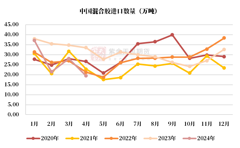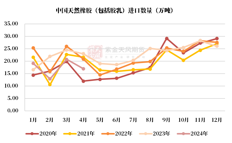 整体进口情况:2024年1-4月中国橡胶进口总量(包括天然橡胶和混合橡胶)为176.1万吨,同比大幅减少22.7%,处于历史偏低位置。
